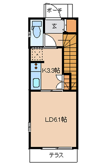 今回ご紹介する物件は間もなく今月中(2012年5月末)に完成する1LDKのメゾネット。間取図をご覧ください、1階は約6帖のリビング・ダイニング、コンパクトなキッチン、トイレ。階段を上がった2階には7.3帖の洋室にウォークインクロゼット、浴室、洗面&脱衣所などがレイアウトされています。2フロアとも狭小ですが、長い時間を過ごすリビング・ダイニングと洋室の広さはしっかり確保されているので、窮屈な感じはないはずです。