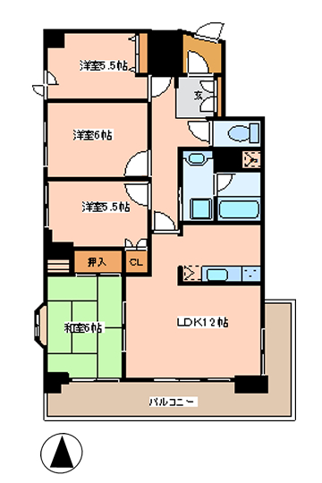 間取りは洋室3室+和室1室+12帖の広いLDKの4LDK。西側に4部屋が並び、東側にLDKと浴室など水回り関係がレイアウトされています。LDKは広さに加えてぐるりと2方をバルコニーに囲まれていますので、開放感に満ちています。設備はエアコン・TVインターホンなど。ガスはLPGではなく、都市ガス仕様になっています。家賃は85,000円(他、敷金3ヶ月・礼金0ヶ月・管理費は賃料に含まれています)。最寄りのコンビニ(ミニストップ)まで徒歩4分。スーパーのサンマリまで徒歩12分。学校は愛宕橋中学校まで徒歩6分、向山小学校まで徒歩14分のロケーションになります。