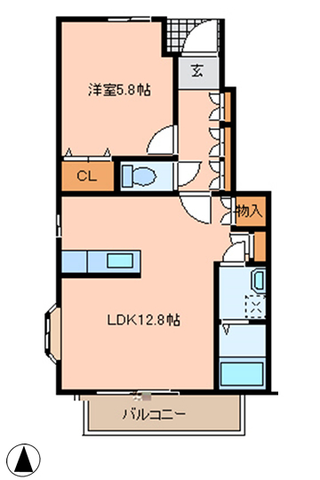 間取りは南面のバルコニーに接した12.8帖の広〜いLDKと5.8帖の洋室のシンプルな造り。若いカップルや小さなお子さまを持つ、ご家族に最適なプランだと思います。玄関から続く通路の片面はすべて物入れに充てられており、洋室には大きめのクロゼット、LDKにも物入れ、外には物置と、かなりの容量が収まるスペースを備えています。