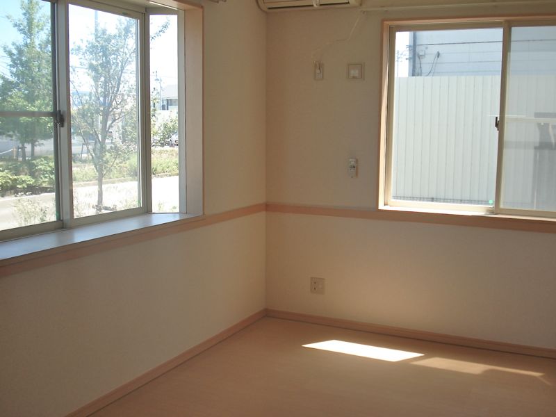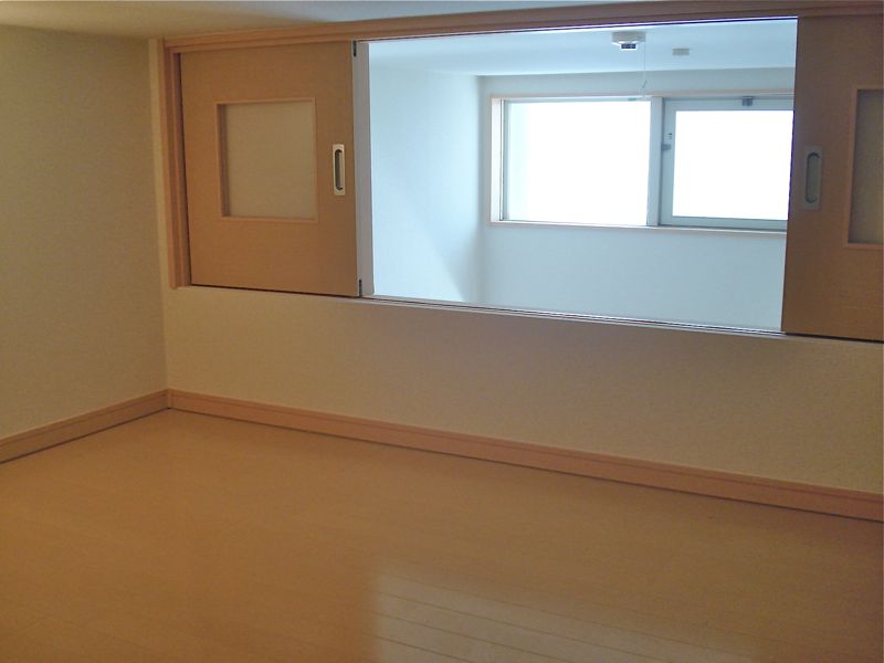 六丁の目南町から七郷へ抜けるメインの道路近く、駐車場を挟み同じデザインのアパートが2棟建っていますが、そのうちの南側1棟の1階、1LDKの角部屋でご入居者を募集中です。タイトル通り、築まだ4年半程度の(2010年2月建築)の築浅物件。間取りは11.5帖のLDKに6帖の洋室、さらに階段を昇ると広めのロフトが用意されています。若いカップルや新婚さん向きの間取りですね。