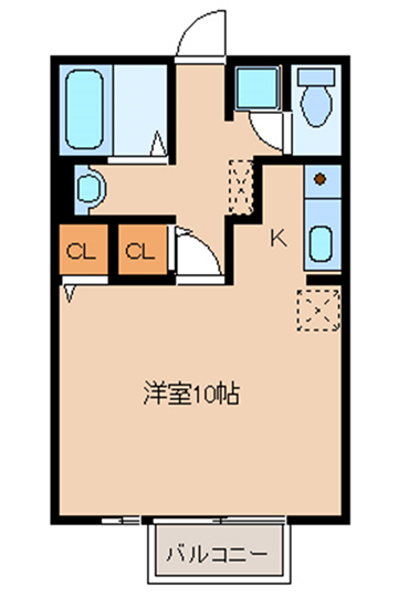 間取りはキッチン部分を含む10帖の居室に浴室、トイレのシングル向けタイプ。