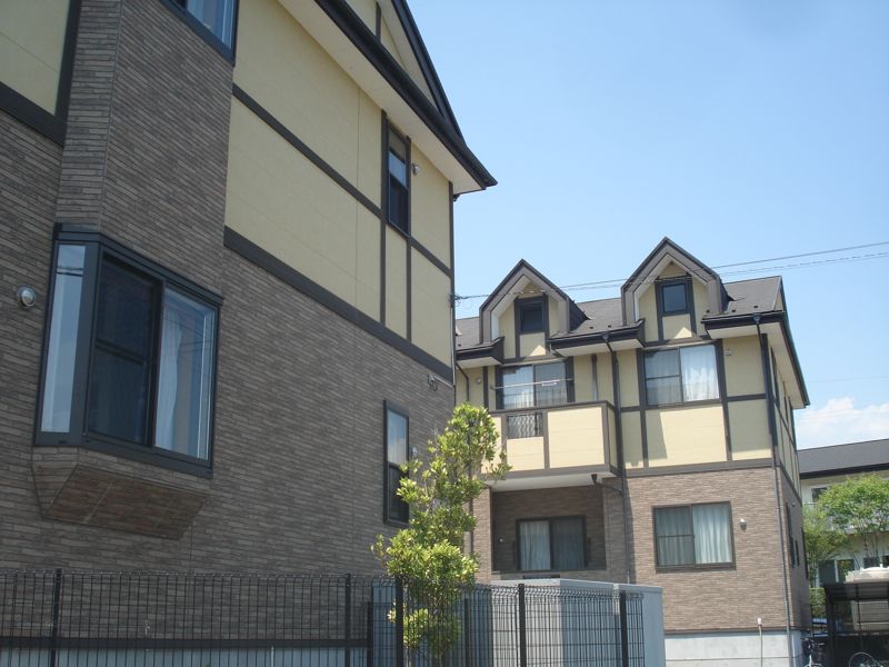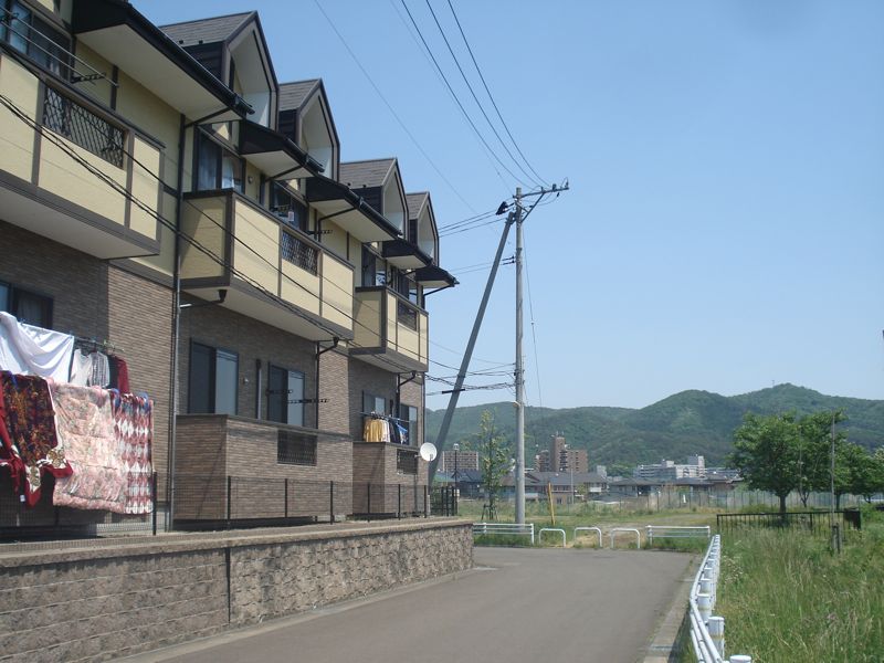 今回の物件は川を挟んで栗生小学校のすぐ向かいの住宅街に建つアパートです。建物は南向きで、やや土台が高く持ち上げられています。