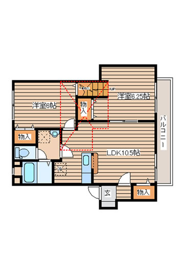 ・10.5帖LDK+6帖洋室+6.25帖洋室プラス、固定階段で上がるロフト付き。