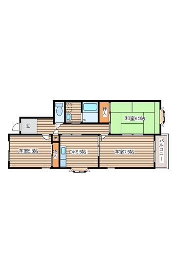 間取りは3DK。部屋数がしっかりあります。5.5帖DK+7.5帖洋室+5.5帖洋室+6.5帖和室(+浴室+洗面+トイレ/バルコニー)そろそろ。個室が必要かなぁ〜、というお年頃のお子様がいるご家族にもぴったりだと思います。